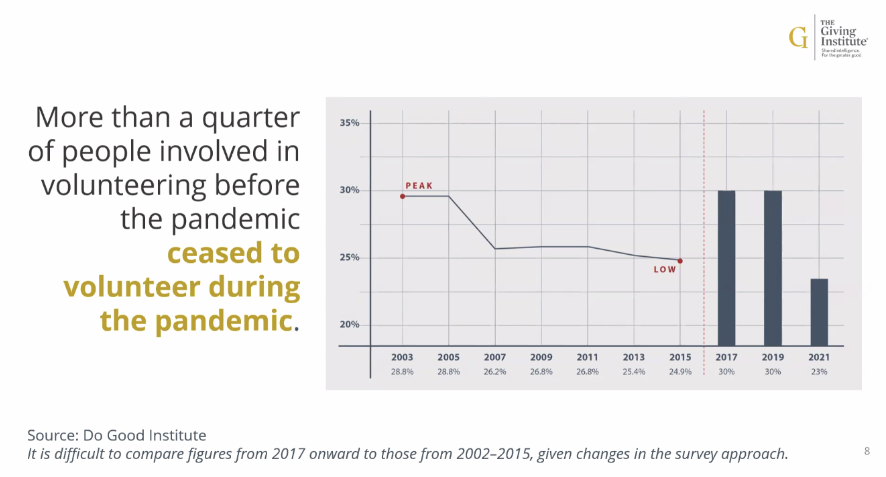 The impact of fewer donors is felt not just in the reduction of money but “when fewer people give to and volunteer with nonprofits, we miss out on the diverse perspectives, social connection, and the practice of civic engagement.”
